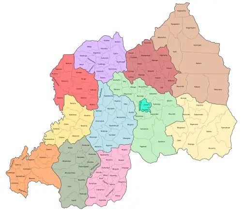 De vijf provincies van Rwanda zijn verdeeld in 30 districten (Kinyarwanda: akarere). Elk district is vervolgens weer verdeeld in sectoren (Kinyarwanda: umurenge), die op hun beurt weer onderverdeeld zijn in cellen (Kinyarwanda: akagali), deze cellen zijn verder onderverdeeld in dorpen (Kinyarwanda: umudugudu).
