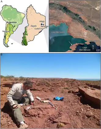 Op de landtong tussen de zuidoostoever van het Lago Barreales en de noordoostelijke oever van het Lago Mari Menuco werd het skelet gevonden van een kleine theropode.