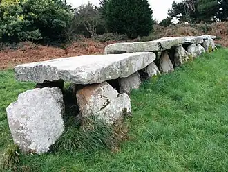In Bretagne liggen in Morbihan Dolmen d'Ar Roc'h, Dolmen de Beaumer, Dolmen du Bünz, Dolmen de Coët-Courzo, Dolmen du Conguel, Dolmen du Crapaud, Dolmen de la Croix, Dolmen de Crucuno, Dolmen du Cruguellic, Dolmen de Cruz-Menquen, Dolmen d'Er Houel, Allée couverte d'Er-Roh, Dolmen d'Er-Roch-Vras, Dolmen des Follets, Dolmen de Goëren, Dolmen de Gornevèse, Allée couverte du Grand Village, Dolmen du Graniol, Dolmen de Guidfosse, Dolmen de Kerangré, Dolmen de Kercadoret, Dolmens de Kerdaniel, Allée couverte de Kergalan, Dolmen de Kerhenry, Dolmen de Kéric-la-Lande, Dolmen de Kerlescan, Dolmen de Kerlud, Dolmen de Kerlutu, Dolmen de Kermané, Dolmen de Kermario, Dolmen de Kermorvant, Dolmens à couloir de Kerroc'h, Dolmen de Kerveresse, Dolmen de Kervingu, Dolmen de Kluder-Yer, Allée couverte de Lann-et-Vein, Dolmen de la Loge-au-Loup, Dolmen de la Maison Trouvée, Tumulus du Mané-Lud, Dolmens de Mané-Bras, Dolmen de Mané-Groh, Dolmen de Mané-Kerioned, Dolmen du Mané-Rutual, Dolmens Men Cam et Men Yann, Allée couverte de Minguionnet, Dolmen de Nelhouët, Dolmen de Penhap, Les Pierres Plates, Allée couverte de la Pointe-de-Guéritte, Allée couverte du Prieuré, Dolmen de Roch-Feutet, Tablettes de Cournon, Dolmen de Tri-Men-de-Castello, Dolmen de Ty-er-Mané, Dolmen de Vagouar-Huen en Le tombeau des géants.