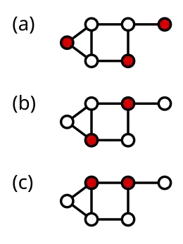 Elke knopenbedekking is een dominerende verzameling, maar het omgekeerde is niet waar. In de figuur is geen enkele van de dominerende verzamelingen een knopenbedekking, want er zijn steeds kanten in de graaf die geen eindpunt in de dominerende verzameling hebben.