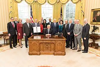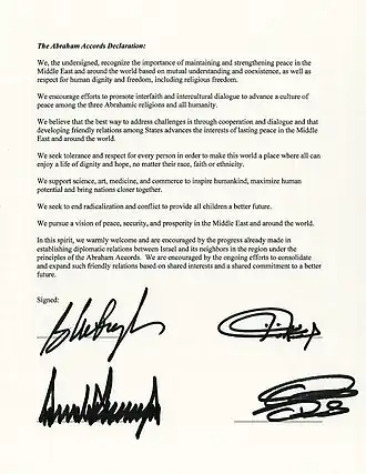 Op 8 november 2016 won Trump de Amerikaanse presidentsverkiezingen. Op 20 januari 2017 werd hij beëdigd als president. In november 2020 verloor hij de presidentsverkiezingen van Joe Biden. Op 20 januari 2021 eindigde zijn ambtstermijn. Tijdens zijn presidentschap werden de Abraham-akkoorden ondertekend, die leidden tot diplomatieke overeenkomsten tussen Israël en verschillende Arabische landen.[3]