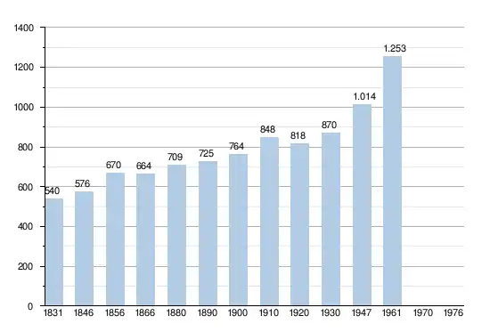 - Bronnen:NIS, Opm:1831 tot en met 1970=volkstellingen; 1976 = inwoneraantal op 31 december