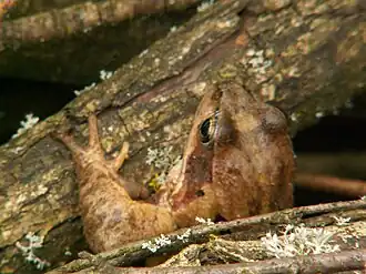Amfibieën als de bruine kikker schuilen op zonnige hellingen vaak bij dood hout, waarschijnlijk vanwege de beschutting en de verhoogde luchtvochtigheid. De vuursalamander kan ook vaak gevonden worden onder dood hout, waar hij ook voorkomt vanwege de beschutting en de grote hoeveelheid regenwormen onder de vochtige stammen. Alle watersalamanders zijn in de landfase ook heel vaak onder stammen of houtstapels te vinden.