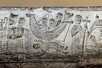 - een gevleugelde figuur (wellicht de overleden heilige).