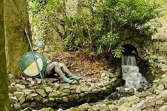 Wanneer het rechter wandelpad bewandeld wordt, loopt men richting een stenen poort met twee onderdoorgangen. De rechter is rolstoeltoegankelijk en loopt om het kasteel heen. De linker volgt een stenen trap de kunstmatige heuvel op richting het kasteel. Langs het pad ligt een beekje waar een groen geklede wachter tegen een boom ligt te slapen. Naast hem staat een stok en ligt een schild.