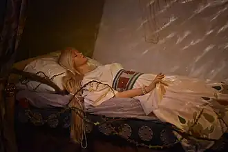 In de tweede ruimte is een, in roze geklede, oude vrouw (de fee) te zien. De vloer ligt vol met wol, terwijl de vrouw achter het spinnenwiel zit. Aan de muur hangt onder meer grijze en rode wol.