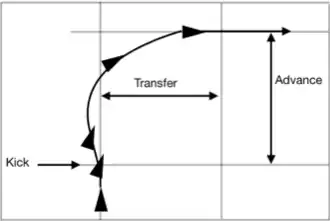 - langsverplaatsing of advance (afstand die het draaipunt aflegt in de oorspronkelijke koers vanaf het moment dat het roer de bevolen uitslag heeft gekregen tot het een koers bereikt loodrecht op de aanvangskoers)