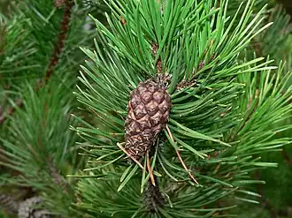 De bladeren (naalden) zijn per twee gebundeld. Ze staan uiteen of staan naar boven gericht en groeien gedraaid. Ze zijn 2–8 cm lang, geel- tot donkergroen en worden 3–8 jaar oud. Elke zijde heeft fijne stomatale lijnen.