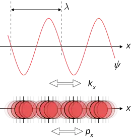 waarin de constante van Dirac voorstelt. In het eendimensionale geval schrijven elementaire leerboeken dit meestal in functie van de golflengte λ en de frequentie ν