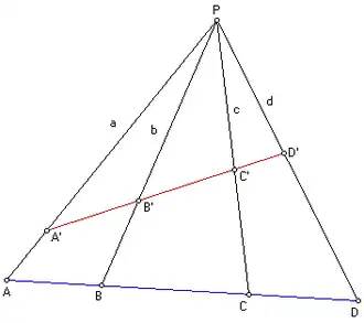 - Van de hoeken tussen twee snijdende rechten en zijn en de bissectrices. De rechte snijdt de vier rechten en in opvolgend de punten en . De punten en zijn dan harmonisch toegevoegd ten opzichte van de punten en .