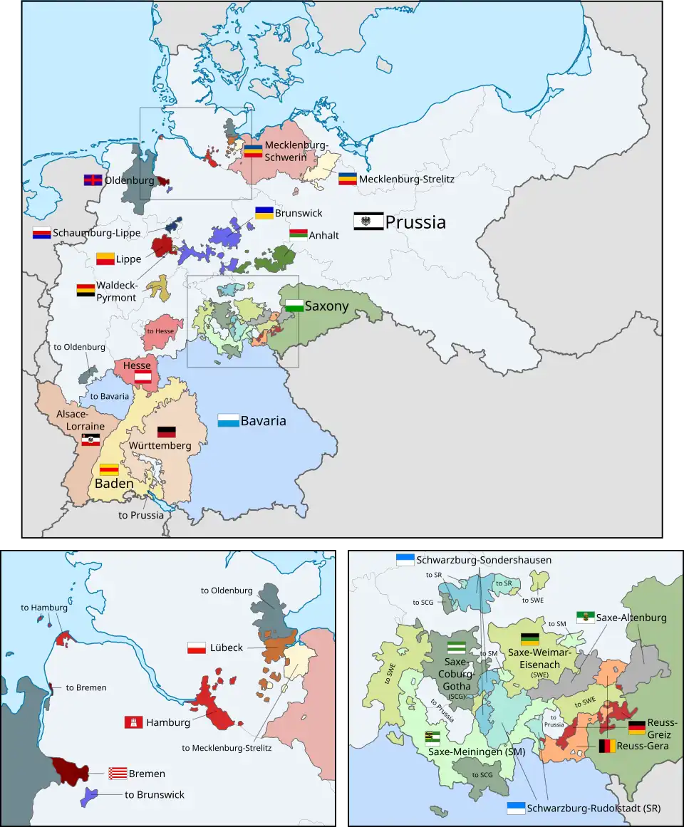 Het nieuwe Duitse keizerrijk bestond uit 25 bondslanden, waarvan drie hanzesteden, en één rijksland (Elzas-Lotharingen). De Noord-Duitse grondwet van 1866 werd met enkele semantische aanpassingen ook de grondwet van het Duitse keizerrijk in 1871. De Rijksdag werd ingevoerd als parlement en gaf, in tegenstelling tot het Pruisische parlement, burgers vertegenwoordiging op basis van direct en gelijk kiesrecht van alle mannen die 25 jaar waren. De staten behielden ook wel hun eigen regering en zo bleven ook de koningen, groothertogen, hertogen en vorsten op hun troon tot 1918. Het leger van de kleinere landen kwam onder Pruisisch bevel, maar die van grotere landen zoals Beieren en Saksen bleven een beperkte autonomie behouden.