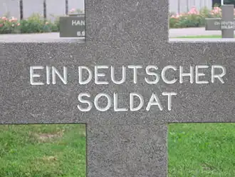 Het centrale kruis vormt het middelpunt van de begraafplaats. Het is gemaakt van beton met een natuurstenen mantel. Er staan lage grafzuilen van natuursteen omheen. Bij het kruis bevond zich tot in 2021 een steen met de tekst: "Auf diesem Friedhof ruhen 31585 deutsche Soldaten".[17]