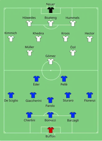 Duitsland speelde in haar kwartfinale tegen Italië, dat de laatste acht bereikte ten koste van Spanje. De Duitsers maakten in de 65e minuut 1-0. Müller speelde Gómez aan op links, die op zijn beurt Jonas Hector met een steekpass tussen twee tegenstanders door het Italiaanse strafschopgebied instuurde. Zijn voorzet stuitte via het been van Leonardo Bonucci voor de voeten van Özil, die vanaf de rand van het doelgebied raak schoot. Italië kwam in de 78e minuut op 1-1. Alessandro Florenzi kreeg een afgeslagen hoekschop terug en zette opnieuw voor. Boateng ging in het strafschopgebied een kopduel aan met Giorgio Chiellini en raakte de bal daarbij met zijn rechterarm. Scheidsrechter Viktor Kassai gaf een penalty, die Bonucci benutte. Beide ploegen maakten in de overige speeltijd plus verlengingen geen doelpunten meer. Een beslissende strafschoppenreeks was nodig. Italië begon en miste drie van haar eerste vijf penalty's. Invaller Simone Zaza schoot over, Graziano Pellè naast en doelman Manuel Neuer stopte de inzet van Bonucci. Aan de andere kant stopte Gianluigi Buffon een strafschop van Müller, schoot Özil op de paal en miste Schweinsteiger bij een tussenstand van 2-2 de eerste kans om het af te maken door over te schieten. Zowel de Italianen als de Duitsers schoten hun volgende drie strafschoppen raak, waarna Neuer die van invaller Matteo Darmian stopte. Hector benutte de volgende wel. Duitsland ging door naar de halve finales.