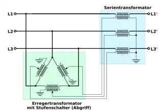 De dwarsregeltransformator bestaat per fase (dus driemaal per apparaat) uit een serietransformator en een regeltransformator. De secundaire zijde van de serietransformator wordt hierbij gevoed met de spanningen uit de regeltransformator van de twee andere fasen. Door de secundaire spanning van de regeltransformator te regelen wordt de gewenste dwarshoek ingesteld.