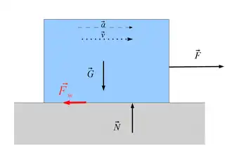 De dynamische wrijvingskracht is evenredig met de normaalkracht , met de dynamische wrijvingscoëfficiënt als evenredigheidsfactor: