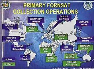 De genoemde afluisterdiensten beschikken over een wereldwijd netwerk van satellietstations waarvandaan de downlinks van communicatiesatellieten wordt opgevangen. Het gaat om de volgende stations met de in 2002 geldende codenamen.
