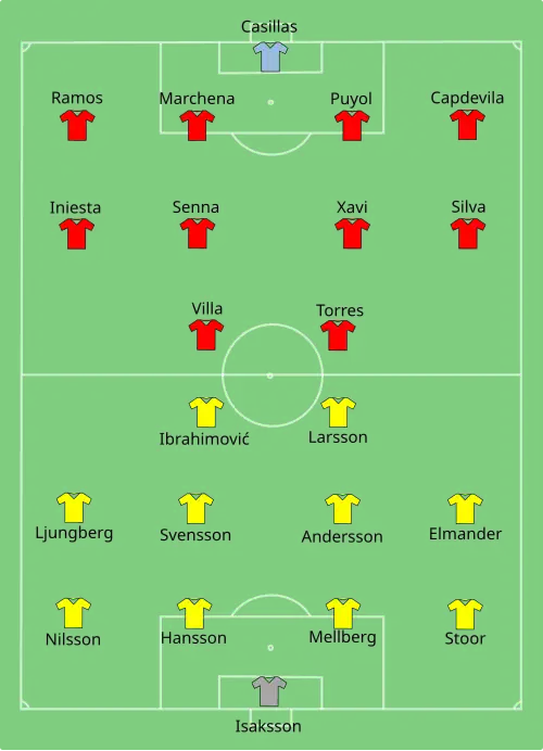 | Andreas Isaksson Mikael Nilsson Olof Mellberg Petter Hansson Fredrik Stoor Anders Svensson Fredrik Ljungberg Zlatan Ibrahimović Johan Elmander Henrik Larsson Daniel Andersson |