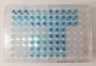 - Sandwich ELISA: Een ongemerkt antilichaam wordt voor de stof die gemeten wil worden gepipetteerd in de welletjes.
