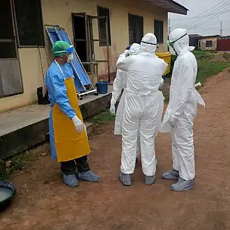 In de West-Afrikaanse ziekenhuizen is niet voldoende plaats om alle patiënten die ebola hebben, op te nemen.[54] Artsen in de ziekenhuizen waar patiënten met ebola worden behandeld, en in het algemeen iedereen die in aanraking komt met patiënten met ebola, moeten beschermende kleding dragen. Deze kleding is vaak niet beschikbaar of wordt niet volgens instructie gebruikt. Ook worden procedures ten aanzien van infectiepreventie niet altijd opgevolgd. Daardoor worden met enige regelmaat ook hulpverleners slachtoffer van ebola.[55] Van 450 gezondheidswerkers is bekend dat zij tijdens deze epidemie besmet zijn geraakt tijdens de zorg voor ebolapatiënten. Hiervan zijn 244 patiënten overleden.[2]