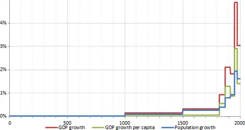 | Economische groei was vrijwel te verwaarlozen tot de Vroegmoderne Tijd en werd voornamelijk door bevolkingsgroei veroorzaakt. Met deze extensieve groei was er dus nog geen sprake van welvaarts- groei. Tot intensieve groei kwam het pas met de industriële revolutie | ||||