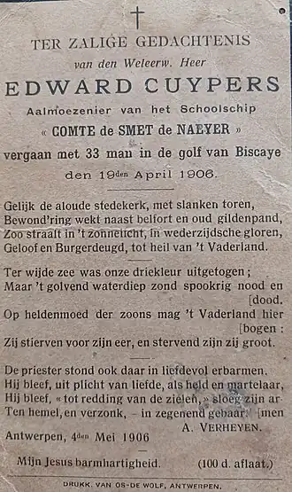 Tijdens de tweede reis van de Comte de Smet de Naeyer was hij een van de 33 opvarenden die de ramp niet overleefden.[2]