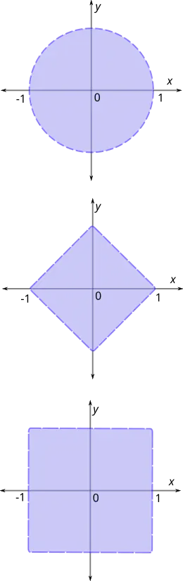De gesloten eenheidsschijf rondom is de verzameling van de punten, waarvan de afstand ten opzichte van kleiner dan of gelijk aan 1 is: