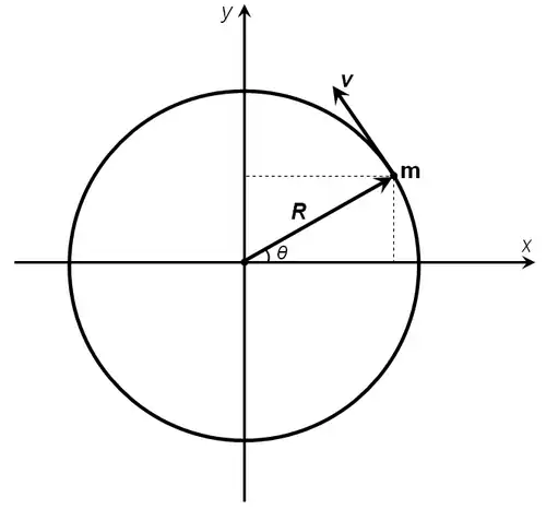 De beweging van een voorwerp dat met een constante hoeksnelheid beweegt langs een cirkel om de oorsprong met straal , kan worden weergeven met de volgende bewegingsvergelijkingen:
