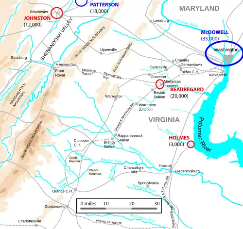 Op 19 juli en 20 juli was het Zuidelijke leger versterkt door troepen van Johnston. Alleen de eenheden van brigadegeneraal Edmund Kirby Smith waren nog onderweg. De meeste versterkingen werden opgesteld in de omgeving van Blackburn’s Ford. Beauregard plande van daaruit een aanval op Centreville. Ook Johnston was te vinden voor dit plan. Mochten beide opponenten gelijktijdig hun plannen ten uitvoer gebracht hebben, zouden beiden geprobeerd hebben om elkaars tegenovergestelde flank te keren.[7]