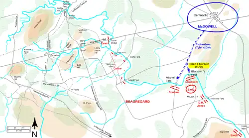 Om 05.15 uur vuurt de artillerie van Richardsons brigade enkele schoten af op Mitchell’s Ford, op de rechterflank van de Zuidelijken. Sommige van deze schoten raakten het hoofdkwartier van Beauregard terwijl hij aan de ontbijttafel zat. Hij gaf onmiddellijk het bevel om troepen te sturen naar de Noordelijke linkerflank bij Centerville. Maar door slechte communicatie werd dit bevel nooit uitgevoerd. Hoewel hij van plan was om brigadegeneraal Richard S. Ewell deze Zuidelijke aanval te laten leiden, kreeg Ewell enkel te horen dat hij zijn positie moest vrijwaren van vijandelijke aanvallen tot hij nieuwe orders kreeg. Brigadegeneraal David R. Jones moest het oprukken van Ewell ondersteunen, maar stelde vast dat hij alleen oprukte. Holmes die geacht werd te ondersteunen kreeg zelfs helemaal geen orders.[9]