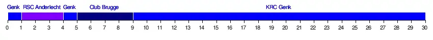 | 2. | KRC Genk | 11 | 37 | 0,30 | 3010 min. | 25 | |