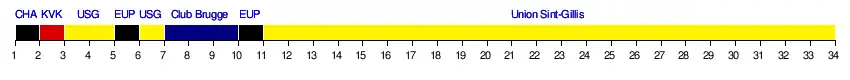 | 2 | Union Sint-Gillis | 6 | 2 | 1 | 3 | 46 | 5 | 5 | 0 | Voorrondes Champions League | 0–2 | — | 3–1 | 0–1 | |