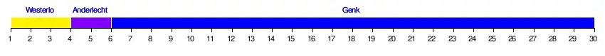 | 3 | KRC Genk | 10 | 4 | 1 | 5 | 47 | 14 | 11 | +3 | Voorrondes Europa League | 1–2 | 0–2 | — | 2–1 | 0–1 | 4–0 | |