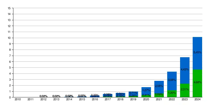 Marktaandeel van elektrische auto's in België per jaar[5]