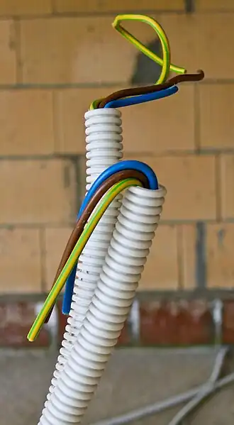 - Er is een maximum aan het aantal draden door één buis. 16 mm (5/8 inch) schuifbuis mag maximaal 3 × 2,5 mm2 + 2 × 1,5 mm2 VD of 2 × 2,5 mm2 + 3 × 1,5 mm2 VD bevatten. Voor 16 mm flexibele buis echter 1 stuks 1,5 mm2 VD minder.