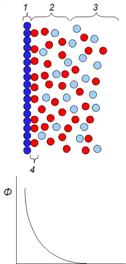 1: geladen oppervlak; 2: diffuse laag met voornamelijk tegenionen; 3: bulk van de oplossing; 4: Sternlaag.