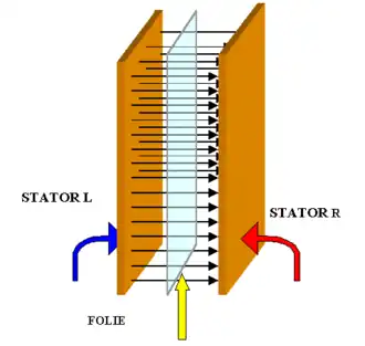In de praktijk blijkt deze uitvoering sterk te vervormen omdat de afstand d tussen de platen varieert zodra de folie in beweging komt. Daarom plaatst men de beweegbare folie tussen twee stators.