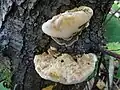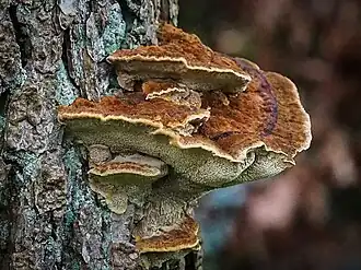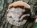 Het vruchtlichaam is eenjarig en groeit meestal dakpansgewijs of consolevormig. Hij heeft een breedte van 2-8 cm, hoogte van 2-6 cm en een dikte van 1-2 cm. De hoed is kaneelbruin tot oranjeroodbruin van kleur en is voorzien van een geelwitte rand. Het oppervlak is in het begin fluwelig, maar wordt later radiair gerimpeld en is voorzien van een golvende rand. De buisjes lopen af. De poriën zijn vrij grof, rond tot hoekig, lichtgrijs tot iets gelig. Jonge zwammen scheiden vaak dikke druppels af (guttatie). De sporenkleur is gelig. Het vlees krijgt met kaliumhydroxide een zwarte kleur.