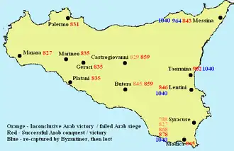 De verovering van Sicilië stuitte op enorme tegenstand van de Byzantijnse troepen. Al met al duurde het meer dan een eeuw voordat het hele eiland door de moslims was veroverd. Syracuse viel in 878 dankzij Giafar Ibn-Muhammad. Taormina hield het vol tot 902. De verovering was pas voltooid in 965 met de val van Rometta.