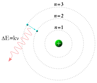 De omgekeerde overgang van een hoger naar een lager niveau, onder afgifte van een foton, vindt gewoonlijk plaats zonder uitwendige beïnvloeding als spontane emissie en wordt gekarakteriseerd door een bepaalde halveringstijd. Hij veroorzaakt discrete emissie-spectraallijnen (bij atomen - vaak - zichtbaar licht, bij kernen gammastraling). In bepaalde gevallen kan ook niet-spontane emissie optreden. Men spreekt dan van gestimuleerde emissie, het verschijnsel waarop de laser is gebaseerd.