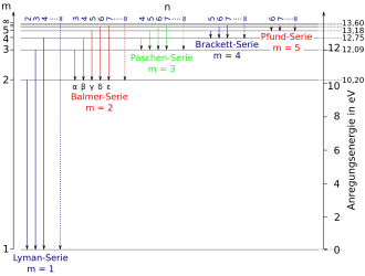 waarin de Rydberg-energie eV, wat echter alleen voor waterstofachtige systemen (atomen met één elektron, zoals H, He+, enz.) geldt.