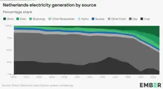 In de periode 2010-2015 steeg het duurzame aandeel in het elektriciteitsgebruik van 12% naar 15% door sterke toename van windstroom die in 2015 7% leverde; zonnepanelen produceerden toen 1%.[1] De CO2-emissie daalde van 170 naar 156 megaton per jaar (9,2 ton per persoon), maar nog niet tot het niveau van 1990 (148 Mt). In 2015 was het doel dat in 2020 14% van alle gebruikte energie in Nederland uit duurzame bronnen zou komen, en in 2023 16%. In 2018 was het 7%, het laagste percentage in de Europese Unie en nog duidelijk onder België en Luxemburg.[2]