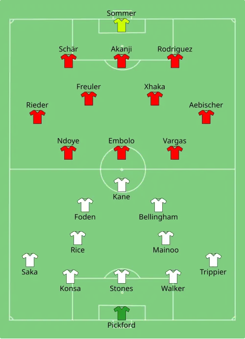 Engeland speelde op 6 juli 2024 in Düsseldorf de kwartfinale tegen Zwitserland, dat in de achtste finales won van Italië. Beide teams creëerden weinig kansen. Zwitserland kwam in de 75ste minuut op een voorsprong toen Breel Embolo een door John Stones aangeraakte voorzet van Dan Ndoye binnentikte. Vijf minuten later kwam Engeland langszij via een geplaatst schot vanaf buiten het strafschopgebied van Saka. In de verlenging die vervolgens gespeeld werd, bracht Yann Sommer redding op een afstandsschot van Rice. Xherdan Shaqiri raakte later direct uit een hoekschop de kruising. Met een 1–1 gelijkspel na 120 minuten werd een penaltyserie gespeeld. De strafschop van Manuel Akanji werd gered door Pickford, terwijl de andere spelers scoorden, waardoor Engeland zich voor de vierde keer plaatste voor de halve finales van het EK.[12]