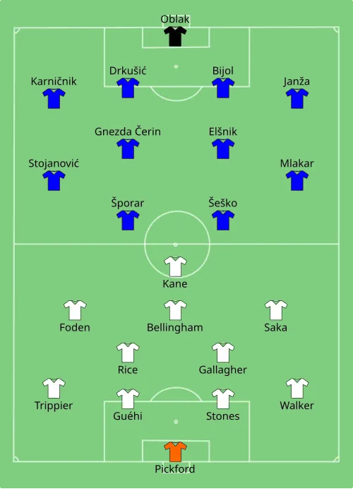 Engeland was voorafgaand aan zijn laatste groepswedstrijd, op 25 juni 2024 tegen Slovenië in Keulen, al verzekerd van kwalificatie voor de knock-outfase. In de twintigste minuut vond Bukayo Saka het net op aangeven van Foden, die buitenspel stond, waardoor het doelpunt werd afgekeurd door de grensrechter. Verder in de eerste helft eindigden een kopbal van Benjamin Šeško, een schot van Kane en een vrije trap van Foden in de handen van doelmannen Jan Oblak en Pickford, terwijl Kane niet wist te scoren uit een voorzet van Kieran Trippier. Ook de tweede helft bleef doelpuntloos, ondanks schoten van Declan Rice en invaller Cole Palmer. Door het gelijkspel eindigde Engeland met vijf punten als groepswinnaar.[9]