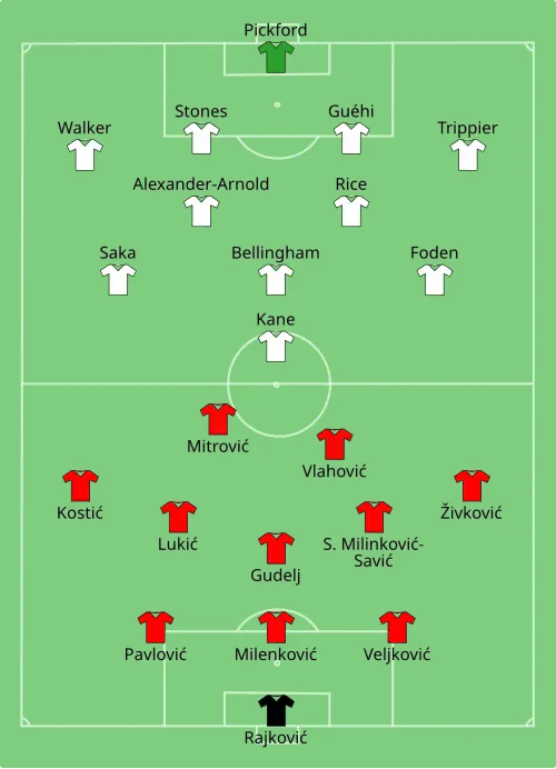 Engeland begon zijn EK op 16 juni 2024 in Gelsenkirchen tegen Servië. Jude Bellingham maakte in de dertiende minuut het enige doelpunt van de wedstrijd door een van richting veranderde voorzet van Bukayo Saka binnen te koppen. In het restant van de wedstrijd kopte aanvoerder Harry Kane op de lat en maakte Jordan Pickford enkele reddingen.[7]