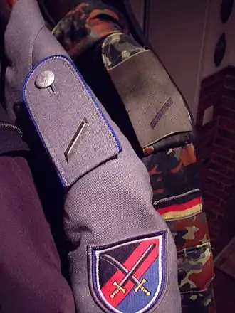 Hiertoe moet de schouder van de jas of het overhemd van een speciale korte band voorzien zijn, die in de mouwinzet is vastgenaaid en bij de hals met een knoop wordt vastgemaakt. De epaulet moet dan om deze band geschoven worden, waarna de band met de knoop wordt vastgemaakt.
