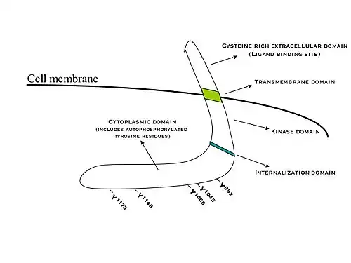 De epidermale groeifactor is een hydrofiel eiwit en kan daarom het hydrofobe celmembraan niet passeren. De overdracht van informatie naar het interne cytoplasma van de cel vindt plaats door binding aan de specifieke, transmembrane EGF-receptor (EGFR). Deze binding induceert dimerisatie van de receptor. EGFR-dimerisatie stimuleert de intrinsieke intracellulaire proteïne-tyrosinekinase-activiteit. Als gevolg hiervan vindt autofosforylering van verschillende tyrosine (Y)-residuen in het C-terminusdomein van EGFR plaats. Deze omvatten Y992, Y1045, Y1068, Y1148 en Y1173, zoals weergegeven in het aangrenzende diagram.[11] Gefosforyleerde tyrosinen dienen als anker- of koppelpunt voor eiwitten in het SH2-domein (SRC-homologiedomein) en maken interactie met andere eiwitten mogelijk.