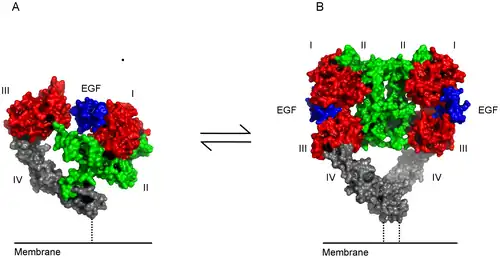 A) Structuur van EGF (blauw) gebonden aan domein I van de auto-inhibitie conformatie van het extracellulaire domein. De twee ligandbindende domeinen zijn rood gekleurd, domein II groen en domein IV grijs.
