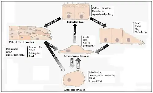 Verschillende signaalroutes (TGF-β, FGF, EGF, HGF, Wnt/bèta-catenine en Notch) en hypoxie kunnen EMT veroorzaken.[7][17][18] In het bijzonder is aangetoond dat Ras-MAPK Snail en Slug activeert.[19][20][21] Slug activeert de stappen van desmosomale loslaten, celverspreiding en gedeeltelijke scheiding aan de cel-celgrenzen, die de eerste en noodzakelijke fase van het EMT-proces vormen. Aan de andere kant kan Slug de tweede fase niet activeren,[22] die de inductie van celbeweeglijkheid, onderdrukking van de cytokeratine-expressie en activering van vimentine-expressie omvat.[23] Het is bekend dat Snail en Slug de expressie van p63-isovormen reguleren, een andere transcriptiefactor die nodig is voor een goede ontwikkeling van epitheelstructuren.[24] De veranderde expressie van p63-isovormen verminderde de cel-celadhesie en verhoogde de migratie-eigenschappen van kankercellen. De p63-factor is betrokken bij het remmen van EMT en de reductie van bepaalde p63-isovormen kan belangrijk zijn bij de ontwikkeling van epitheelkankers.[25] Van sommigen van hen is bekend dat ze de expressie van cytokeratines reguleren.[26] Er wordt ook gesuggereerd dat de fosfatidylinositol 3'-kinase (PI3K)/AKT-as, de Hedgehog-signaalroute, de celkernfactor NF-κB en de activerende transcriptiefactor 2 betrokken zijn bij EMT.[27][28][29][30]