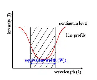 Hier is de intensiteit van het continuüm aan beide kanten van de absorptielijn (of emissielijn), terwijl de intensiteit is over het golflengteïnterval van de spectraallijn. Dan is de breedte van een hypothetische lijn die een intensiteit nul bereikt en dezelfde geïntegreerde flux ten opzichte van het continuüm heeft als de werkelijke lijn. Deze vergelijking kan toegepast worden bij emissie of absorptie; bij emissielijnen is de equivalente breedte negatief.