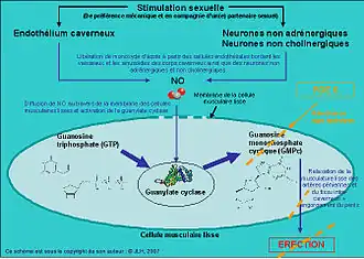 Stikstofmonoxide diffundeert naar de gladde spieren rondom de slagaders van de corpora cavernosa. Stikstofmonoxide is een vasodilaterend middel en activateert het enzym guanylaatcyclase (GC). Dit enzym zet het ribonucleotide guanosinetrifosfaat (GTP) om in cyclisch guanosinemonofosfaat (cGMP). Dit cGMP op zijn beurt doet het gladde spierweefsel van de zwellichamen van de penis verslappen.